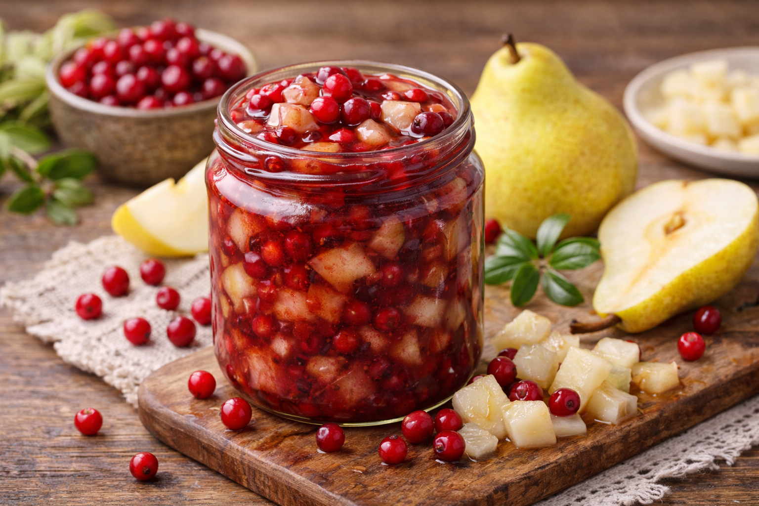 Bruknių ir kriaušių uogienė – tai subalansuotas saldumo ir malonios rūgštelės derinys, puikiai tinkantis šaltajam sezonui. Bruknės suteikia gaivumo ir ryškumo, o prinokusios kriaušės – natūralaus saldumo bei švelnios tekstūros. Ši uogienė tinka ne tik prie pusryčių patiekalų, bet ir kaip priedas prie mėsos ar sūrių.