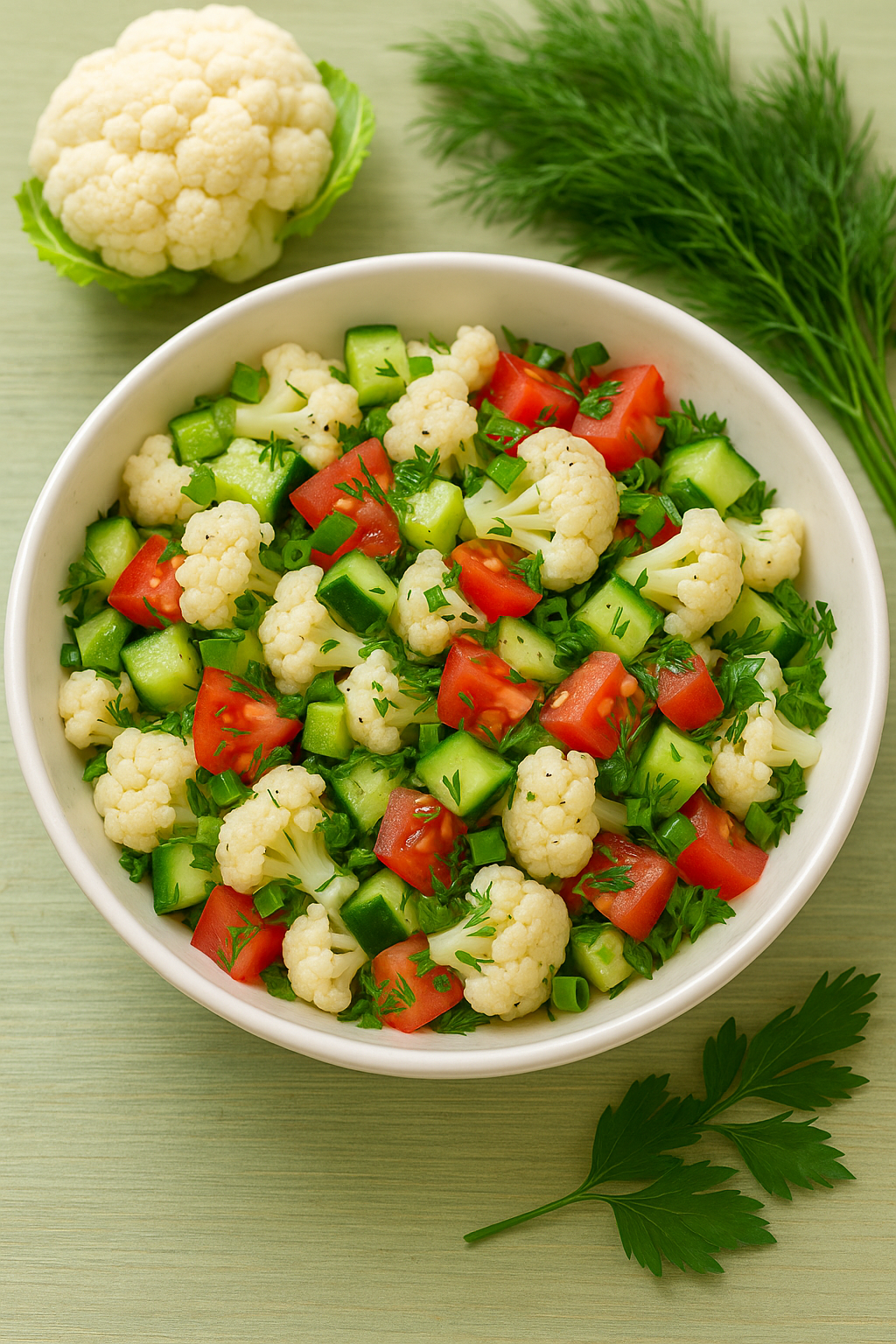 Pamenu, kai vasaros pradžioje močiutės darže viskas žaliuodavo – krapai, svogūnų laiškai, o žiediniai kopūstai stovėdavo gražūs kaip baltos karūnos. Kai tik pasirodydavo pirmieji, mes juos naudodavome ne tik sriuboms, bet ir šviežioms salotoms – gardžioms, lengvoms ir labai gaivioms. Šis receptas – tarsi duoklė tiems vasaros pietums, kai saulė kaitina, o norisi kažko paprasto, bet tokio skanaus, kad net šakutė sustoti nenori.