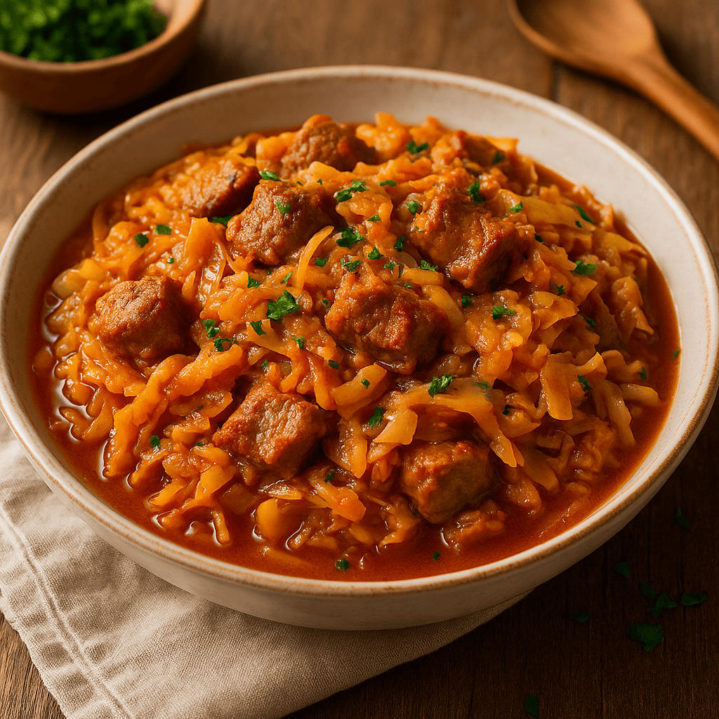 Ir iš tiesų — šitas kopūstų troškinys su mėsa yra vienas tų patiekalų, kurie sujungia paprastumą, kaimišką šilumą ir sotų namų kvapą. Toks troškinys tinka tiek kasdienai, tiek savaitgalio stalui, o kartais – ir tiems vakarams, kai norisi sugrįžti į vaikystę.