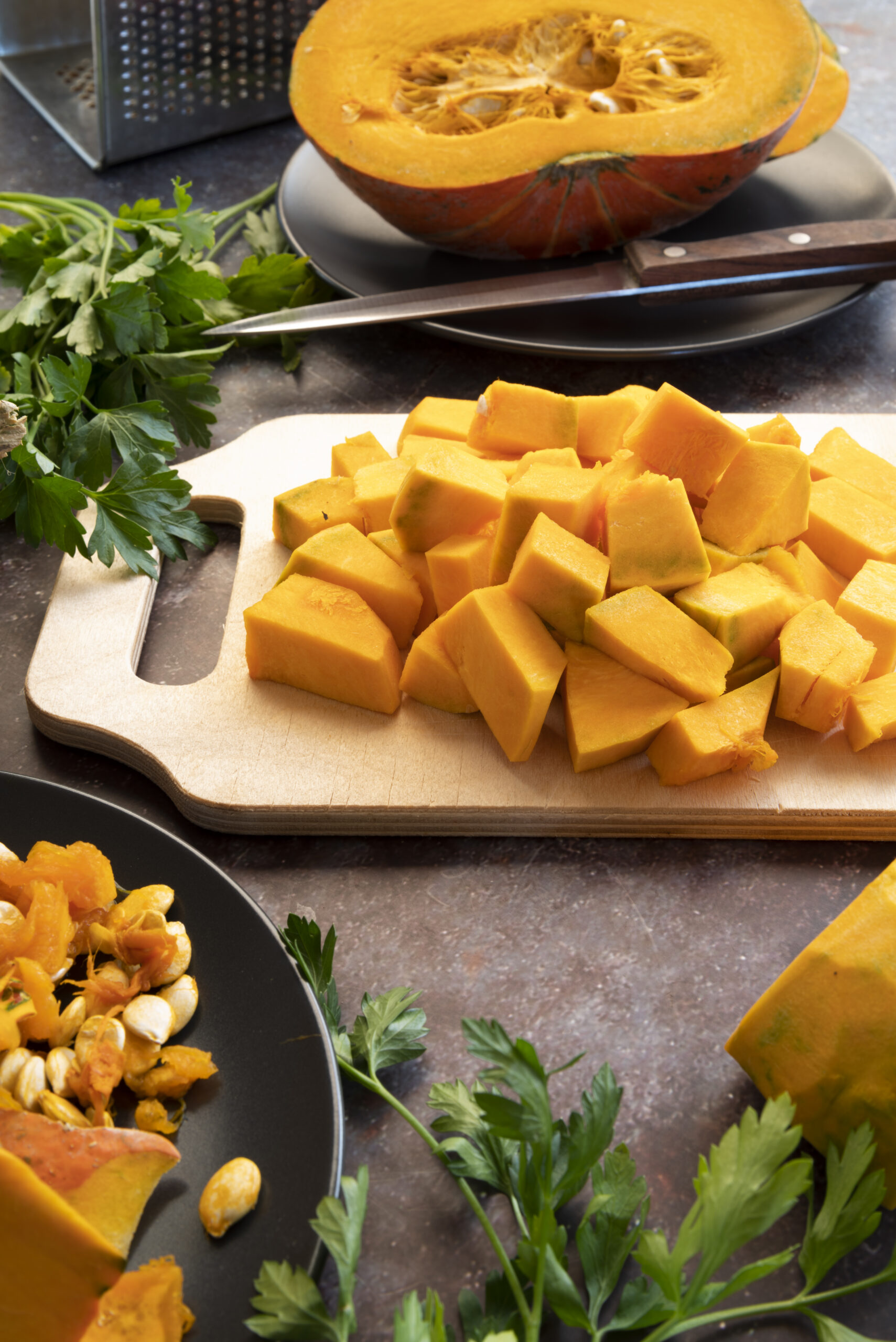 - Moliūgą nulupkite, išimkite sėklas ir sutarkuokite.