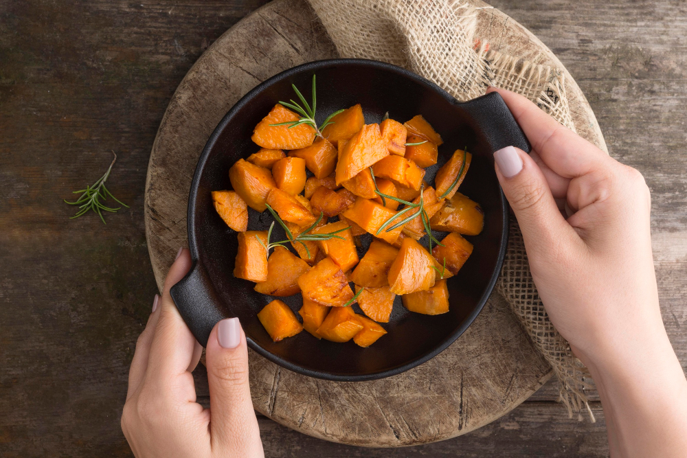 Orkaitėje keptos saldžios bulvės tinka prie daugelio patiekalų ir gali būti valgomos pačios.