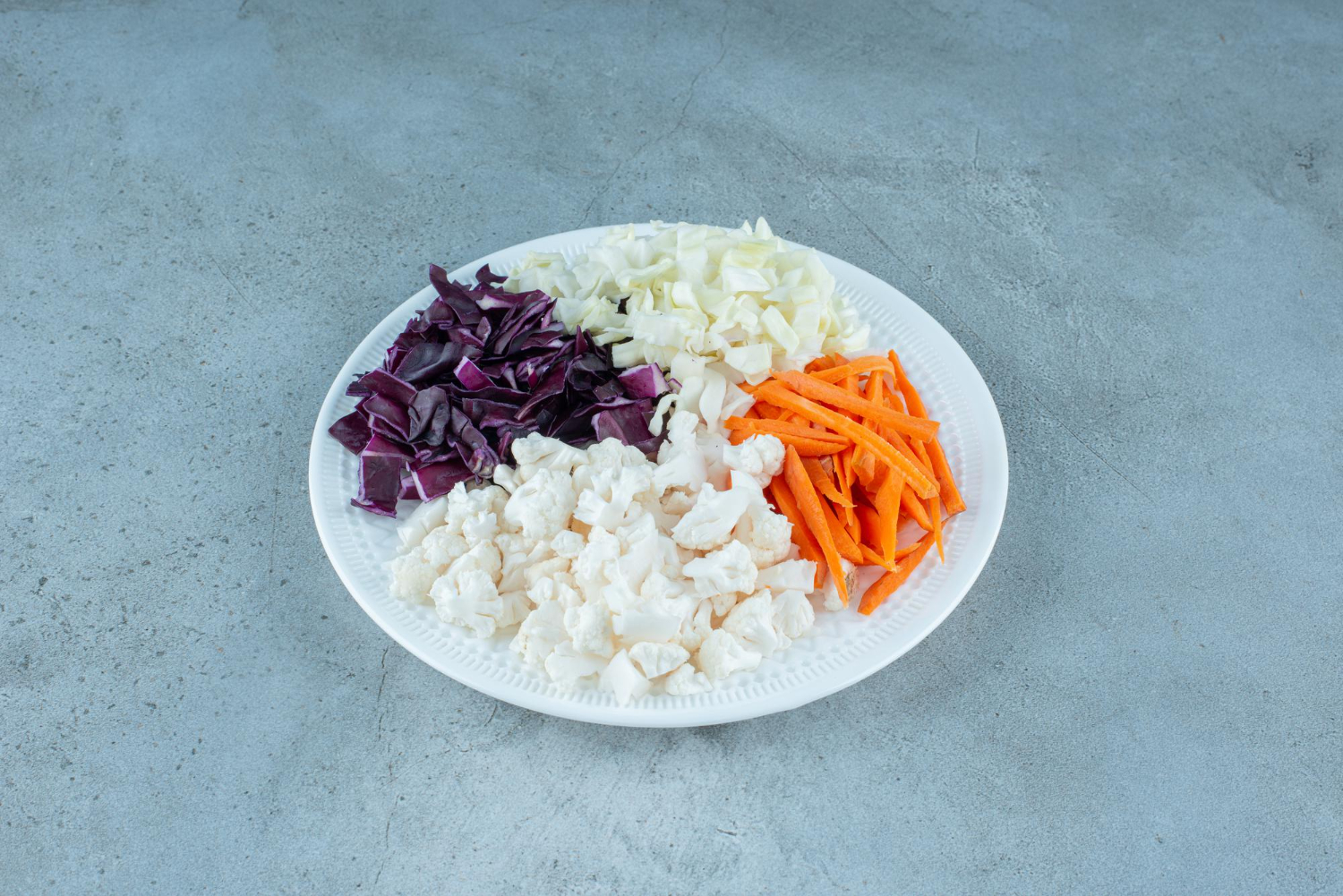 1. Daržovių paruošimas. Žiedinį kopūstą nuplaukite ir suskaidykite į smulkius žiedynėlius. Baltąjį ir raudonąjį kopūstą supjaustykite plonomis juostelėmis. Morkas nulupkite ir sutarkuokite stambia tarka arba supjaustykite šiaudeliais, kaip nuotraukoje.